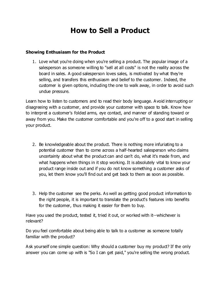 How to sell a product. Whether youre selling a product or service to a customer an idea or a plan to your management or investors or yourself to an employer your ability to sell will play a huge role in your success. Even if youve never owned a physical store you can start selling products online for a profit with this guide. At its most basic level a sales program is defined principally by what you sell who you sell it to and how you sell it.